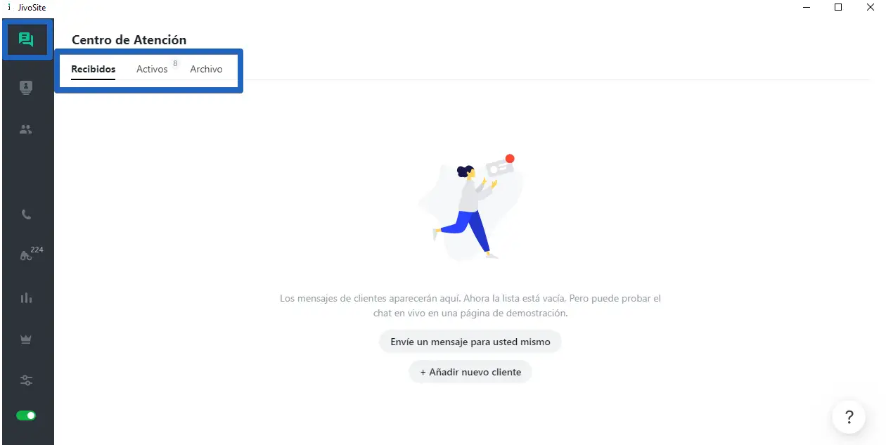 El Centro de Atención es la primera sección de nuestra aplicación. Está localizado en el lado superior izquierdo de la app y almacena todas las conversaciones con los clientes junto con las llamadas. Contiene 3 pestañas - Recibidos, Activos y Archivados. Vamos a mira cada uno detalladamente.