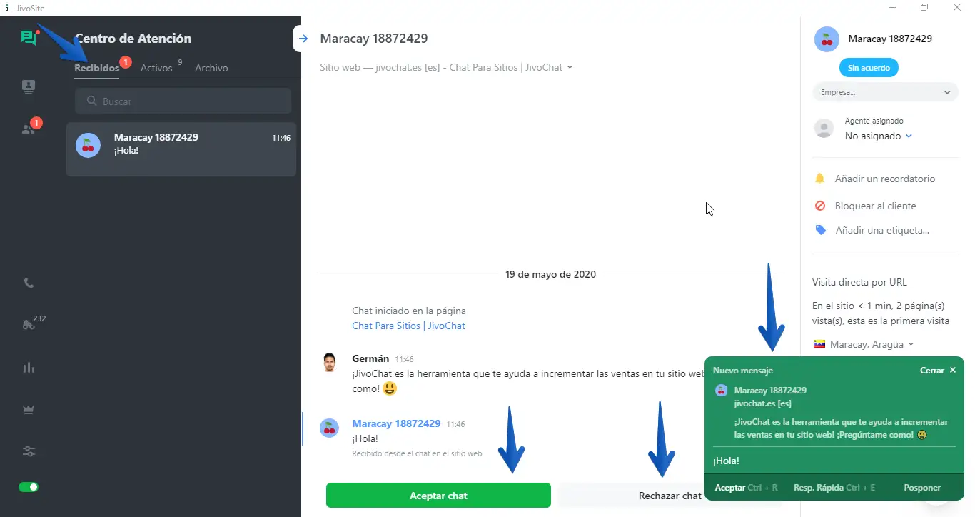 Los Recibidos contiene todos los nuevos chats que no han sido aceptados todavía por nigún agente. En esta pestaña, podrá aceptar los chats. Cuando ignore o posponga un chat, la notificación se ocultará por un periodo corto de tiempo. Sin embargo, regresará a los Recibidos después de algún tiempo y esto se repetirá hasta que el chat sea aceptado por alguno de los agentes en línea disponibles.
