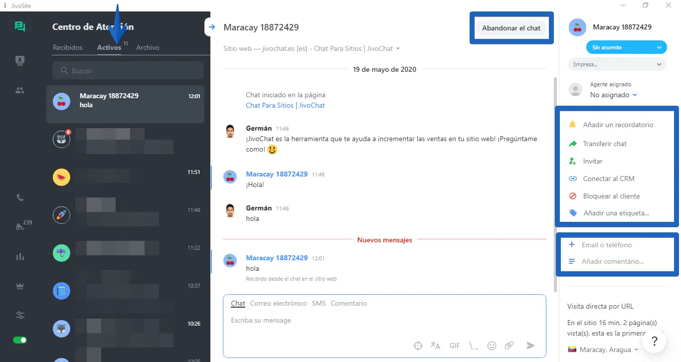 En Activos encontrará todos los chats activos con clientes en ese momento. En esta sección, es en donde habla en tiempo real con los clientes. Además de ver el historial de conversación y el espacio para escribir una respuesta, tambén verá el panel de información del cliente y los botones de chat: Configurar un recordatorio, transferir un chat o invitar a un colega a una conversación, reportar como spam, entre otras. Del lado derecho superior puede encontrar la opción Abandonar chat. al hacer clic, el chat se cerrará y será enviado a los Archivados.