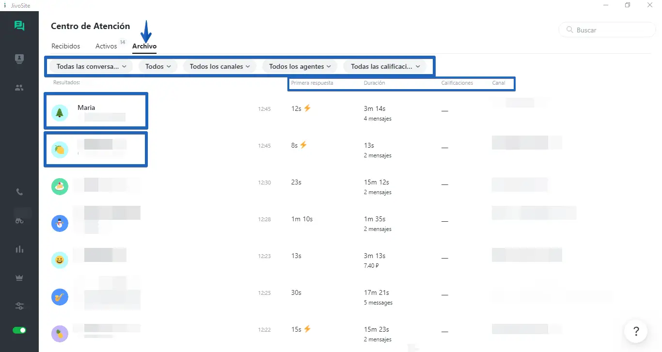 Los Archivados le permiten ver todas las conversaciones cerradas con algunas estadísticas como hora de cada una. Puede usar filtros de busqueda en la parte superior para encontrar una conversación especifica. Además hemos añadido una herramienta genial - ahora puede unirse al chat con un cliente si salir de los Archivados. Solo haga clic en Unierse al chat y envíe mensajes al cliente al momento, luego podrá regresar a los resultados de búsqueda.