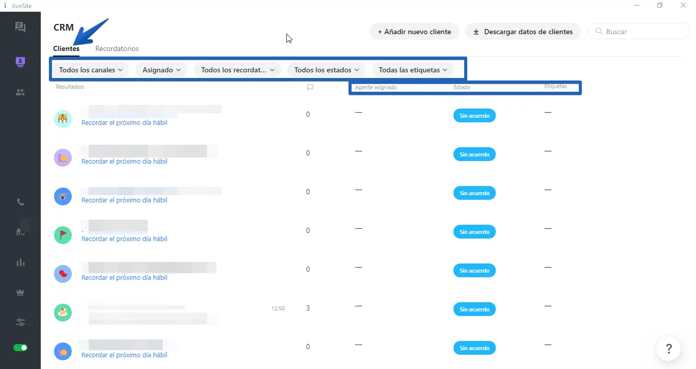 La pestaña de Clientes habla por si misma - aquí encontrará la lista de clientes con los que ha hablado en JivoChat. Todo el historial de conversación con cada cliente estará también disponible con estadisticas cómo el número total de conversaciones, información acerca del [Agente Asignado] (https://www.jivochat.es/help/agentapp/assigned-agent.html), los Estados de clientes y las etiquetas añadidas. Así como en los Archivos, los filtros y campos de búsqueda también estarán disponibles. Además, puede añadir clientes manualmente o descargar la lista de clientes.