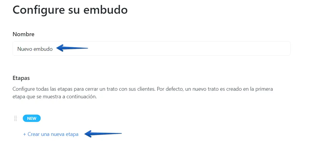 Vaya a Ajustes > Ajustes CRM. Seleccione el embudo a editar y haga clic en ‘Crear un nuevo embudo de ventas’.