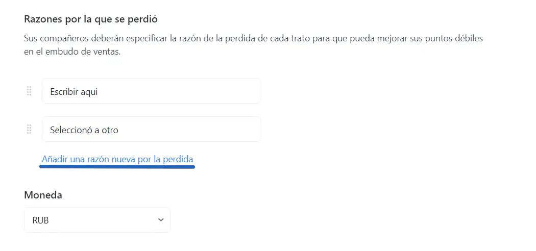 Luego puede editar las ‘Razones por las que se perdió’ — son opciones que necesita seleccionar cuando un prospecto es "perdido" en la etapa final.