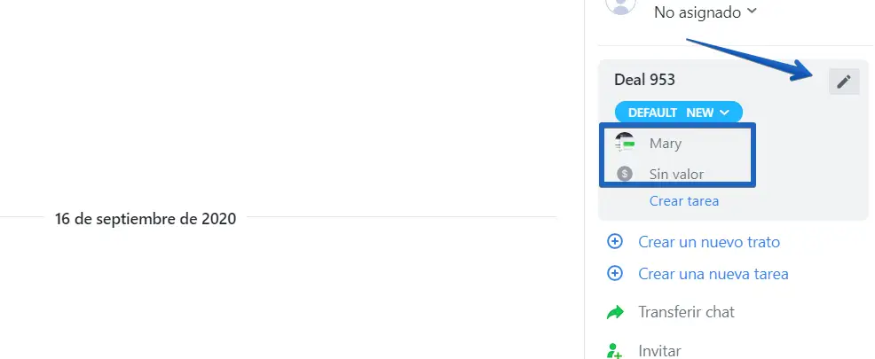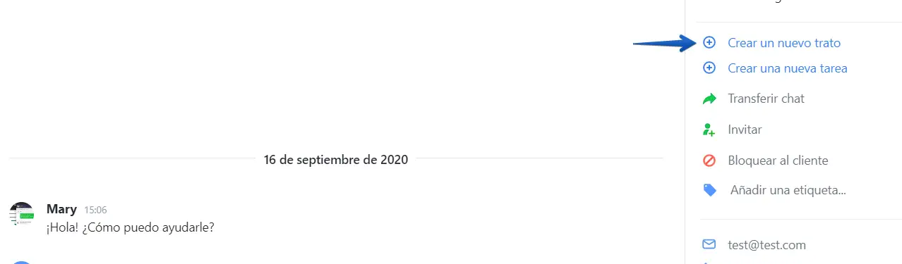 Puede añadir un nuevo trato para un cliente directo desde un chat. Solo haga clic en "Crear un nuevo trato’ en el panel derecho.