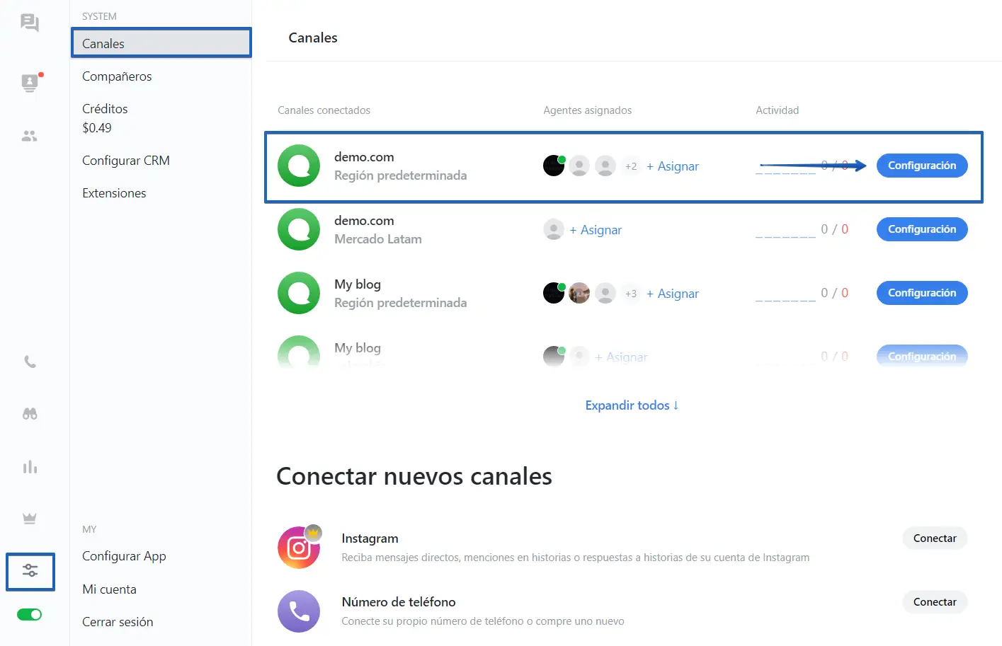 Para cambiar la configuración de diseño de su widget de JivoChat, inicie sesión en nuestra aplicación web o de escritorio y vaya a Ajustes -> Canales -> Configuración (junto al nombre del sitio web).