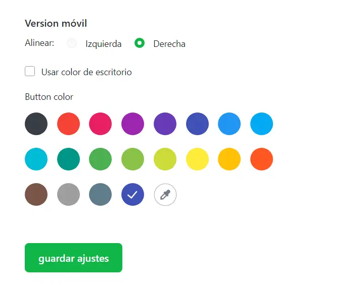 También es posible personalizar el aspecto del chat en la versión móvil de su sitio. Puede elegir el color del botón de chat entre los colores sugeridos o incluso personalizar su propio color. Puede marcar la opción "Usar color de escritorio" para usar los mismos colores que su widget de escritorio. Además, puede elegir de qué lado se ubicará el botón de chat: a la derecha o a la izquierda.