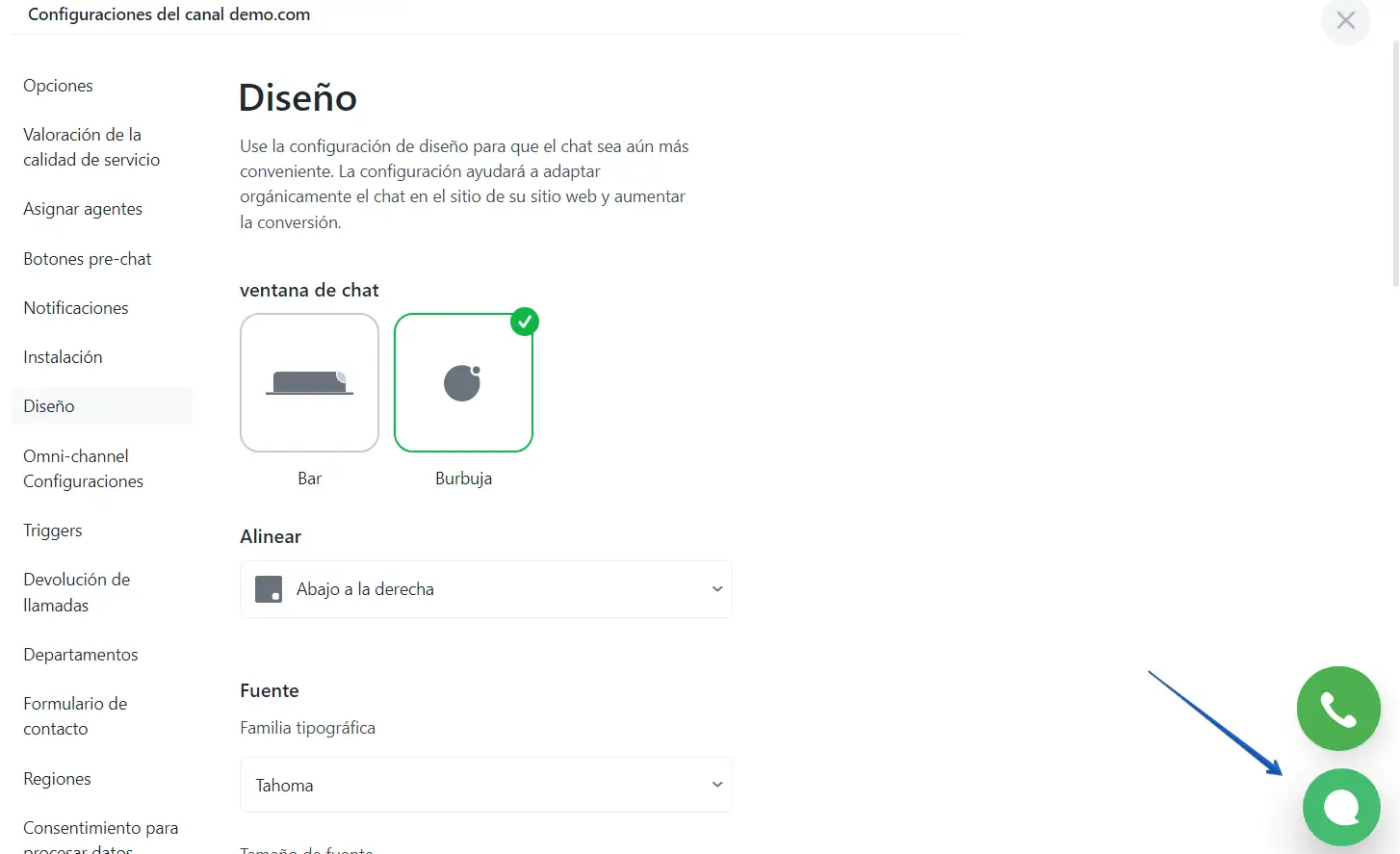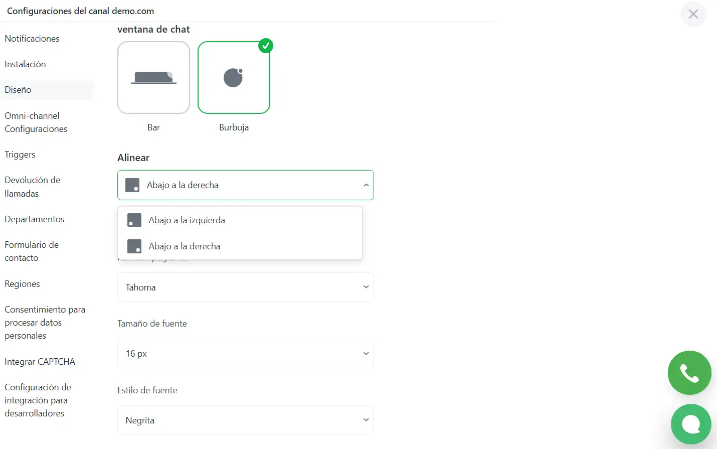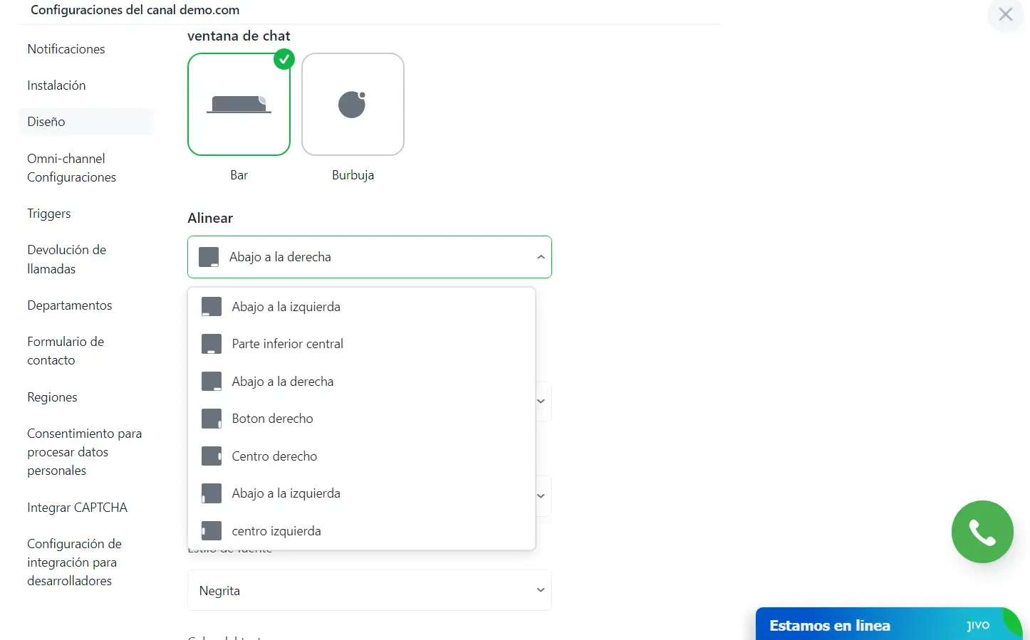 Quizás la configuración más importante, además del esquema de colores, es la posición del botón y la ventana de chat, o más bien, dónde se ubicará exactamente nuestro servicio en su sitio.