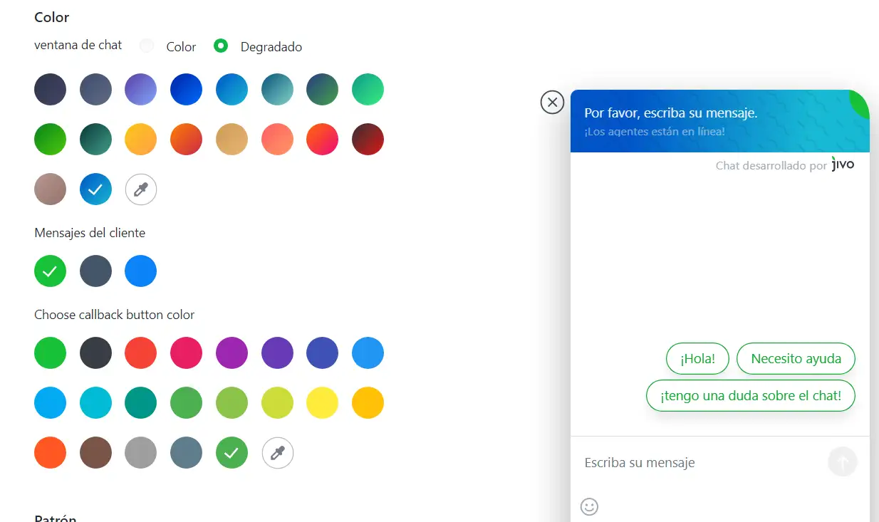La configuración también le permite ajustar el fondo de los mensajes del cliente y el color del botón de devolución de llamada. Estos colores se pueden seleccionar de una lista de colores sugeridos.