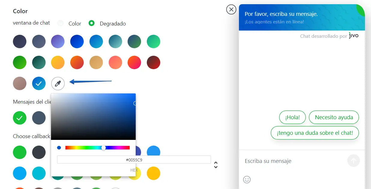 En la subsección Color, puede establecer colores para el botón de chat: elija un esquema de color de las opciones disponibles o incluso personalice su propio color haciendo clic en el icono del cuentagotas. Es posible el diseño monocromático y degradado del botón de chat.