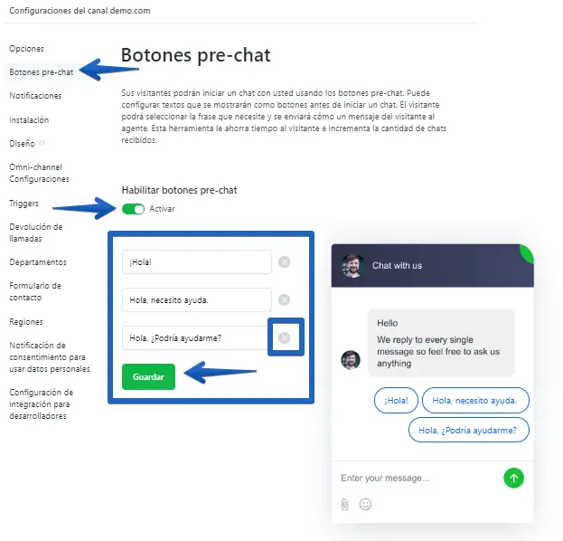 Ahora, vaya al menú "botones pre-chat". Aquí encontrará la opción para activar/desactivar los botones pre-chat y los botones pre-chat por defecto que podrá personalizar. Puede tener hasta 3 botones y 31 caracteres en cada uno.