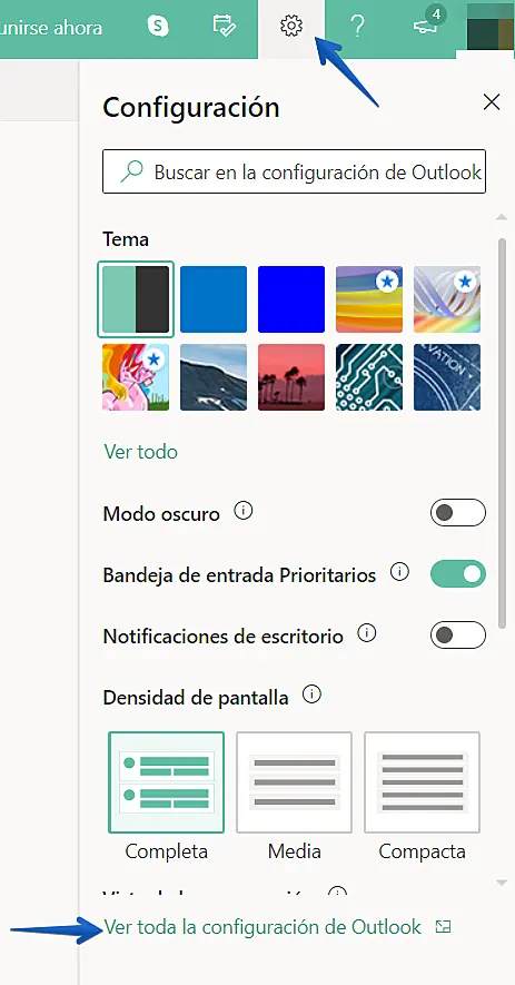 1. Inice sesión en outlook y vaya a la "configuración"-> "ver toda la configuración de outlook"
