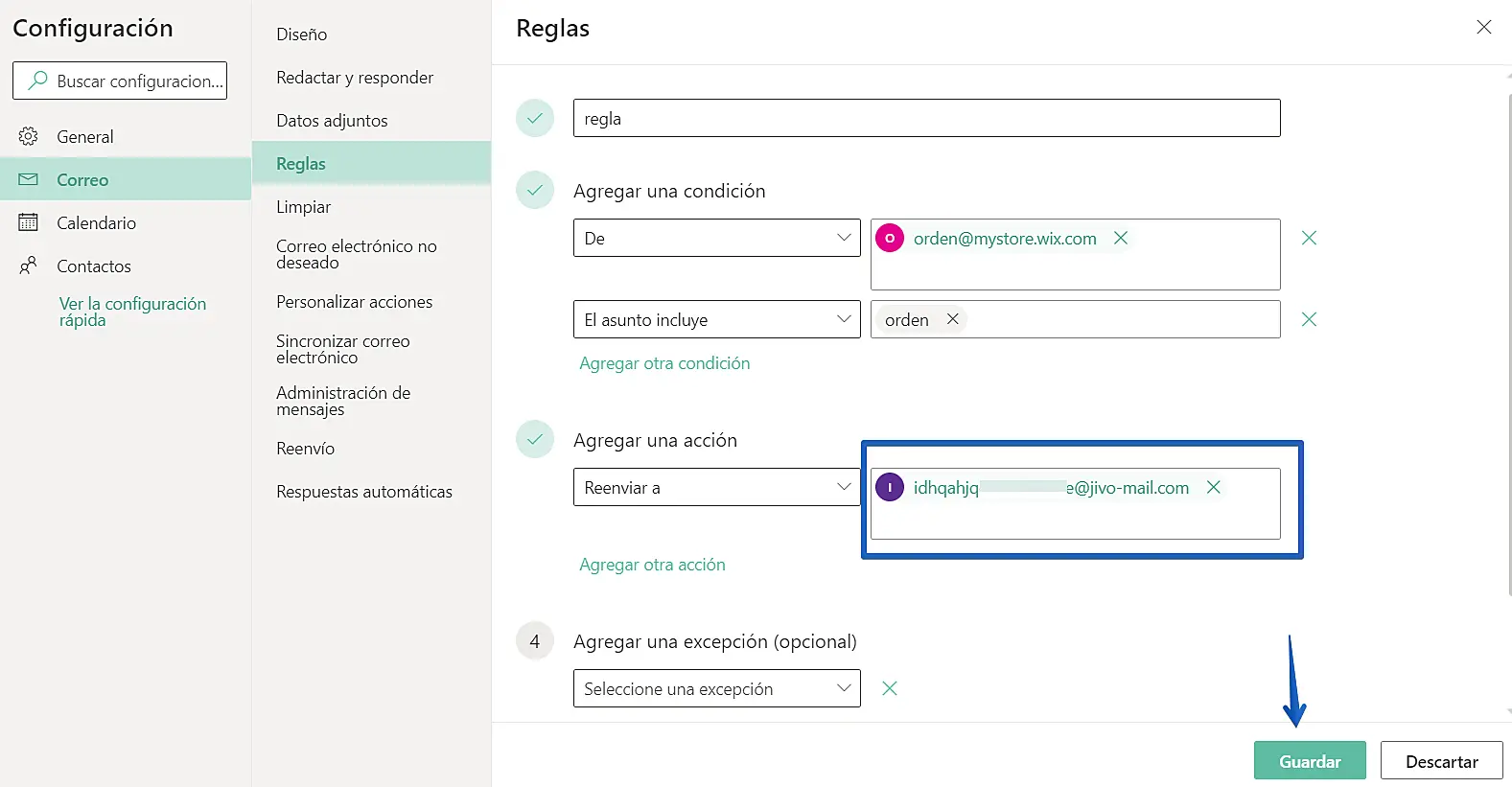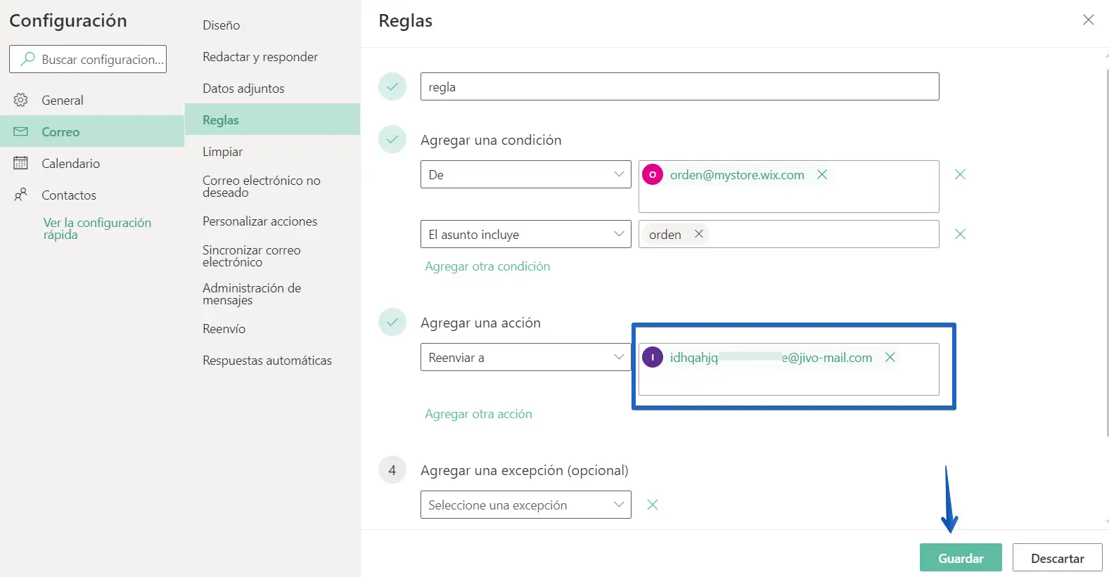 2. En este menu deberá seleccionar la condición, la palabra que contiene y el correo de reenvio