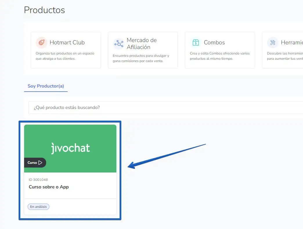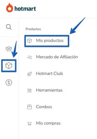 El siguiente paso es ir al panel de Hotmart y abrir la opción para colocar el chat en el checkout. Ingrese a su cuenta de Hotmart y haga clic en "Productos" -> "Mis Productos':