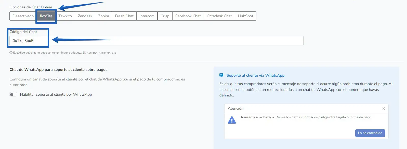 Desplácese un poco hacia abajo y ya verá la sección "Opciones de chat en línea". Seleccione la opción "JivoSite", pegue el widget_id que copió del app de JivoChat desde su código en el campo "Código de chat" y haga clic en "Guardar":