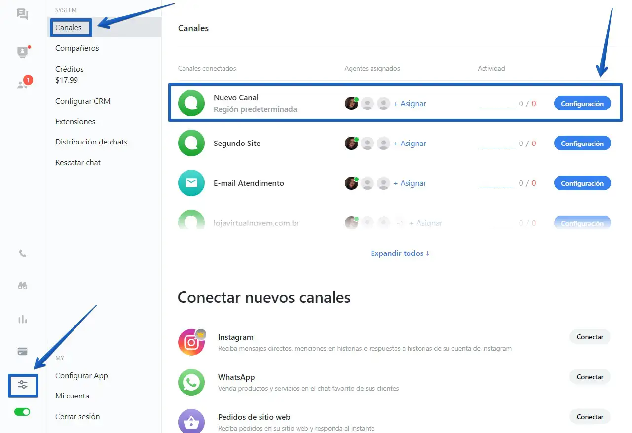 Dentro de la aplicación, haga clic en "Ajustes" -> Canales -> Configuración (botón azul del lado derecho del canal).