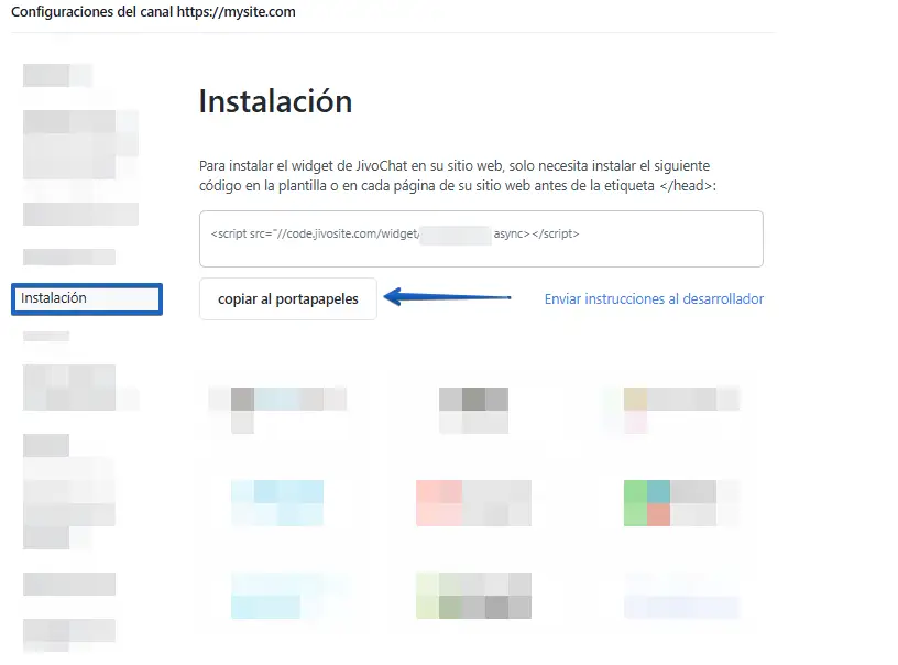 Copie el script de instalación desde su cuenta de JivoChat en "Configuración" -> "Copia en el portapapeles".