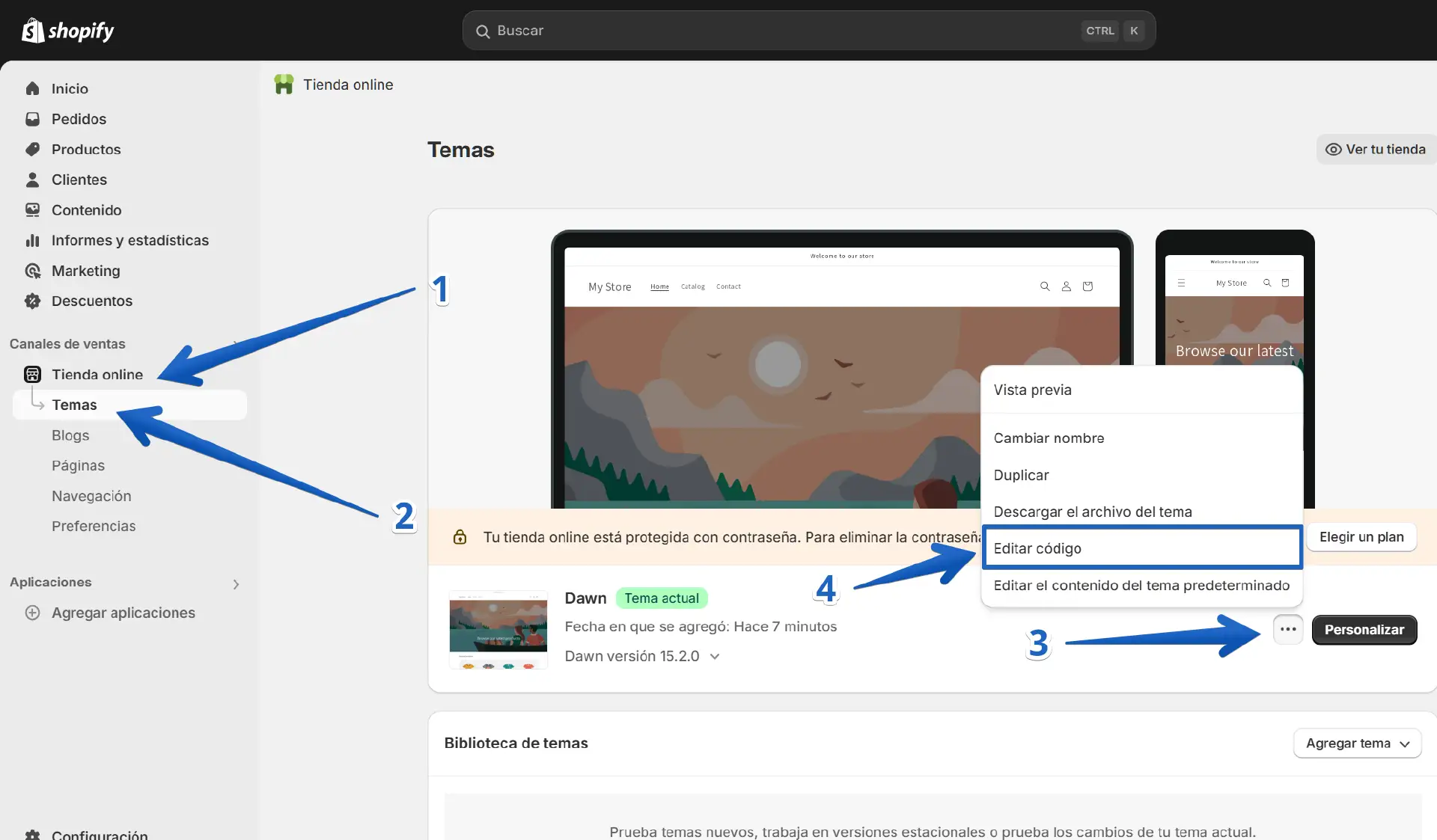 Ingrese a su panel de Shopify -> en la pestaña "Canales de ventas", haga clic en "Temas" -> Luego, seleccione los tres puntos junto a "Personalizar" y elija "Editar código".