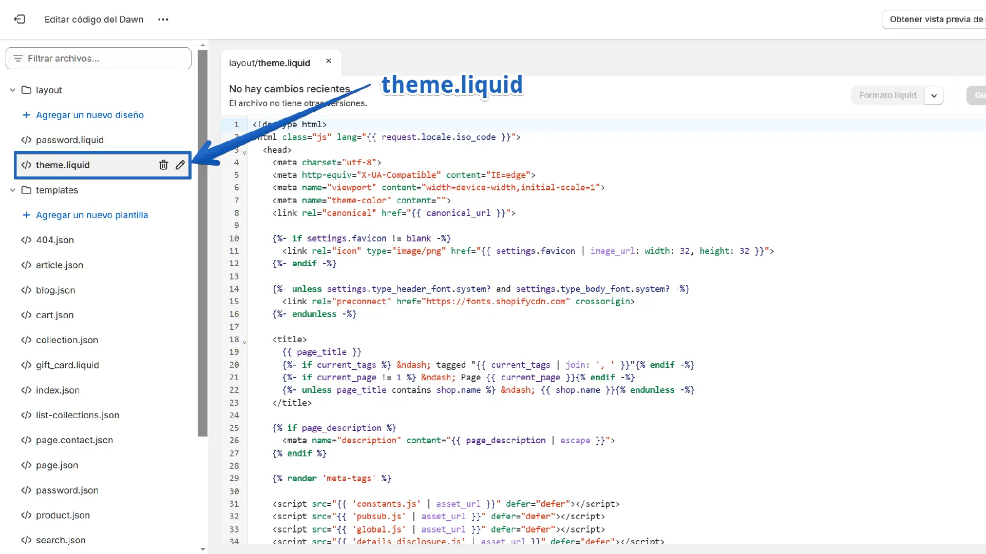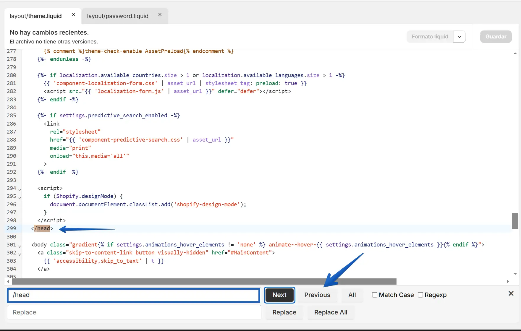 Abra "theme.liquid" -> Busque y haga clic en "Previous".