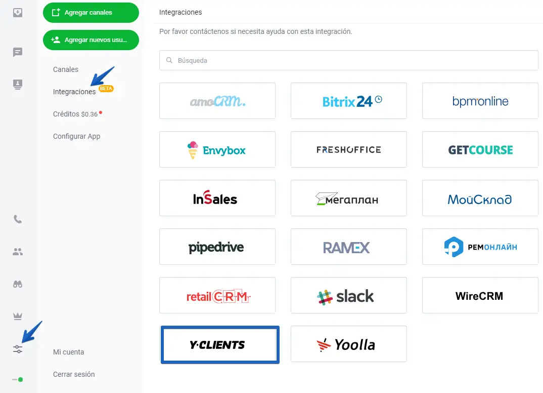 Para integrar con Y-Clients, abra su Aplicación del agente y vaya a "Ajustes"-> "Integraciones" y haga clic en Y-Clients.