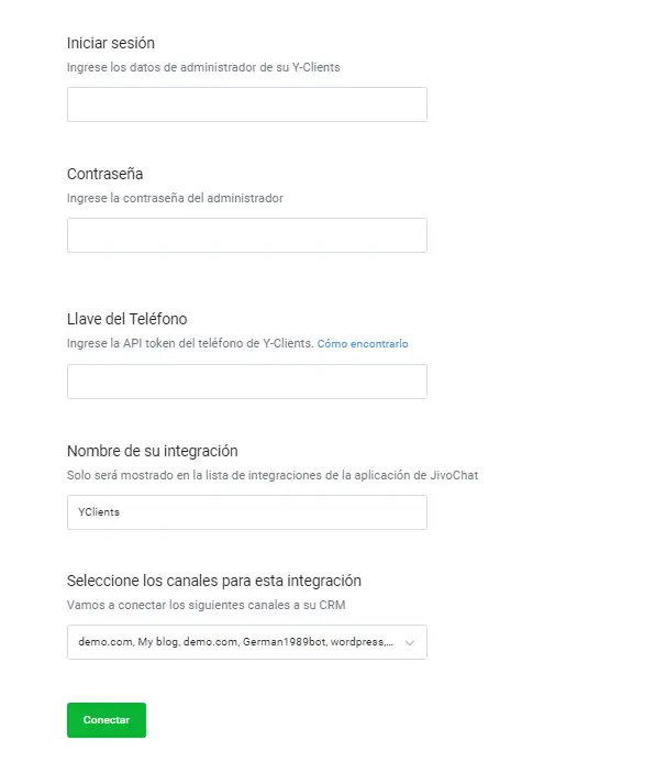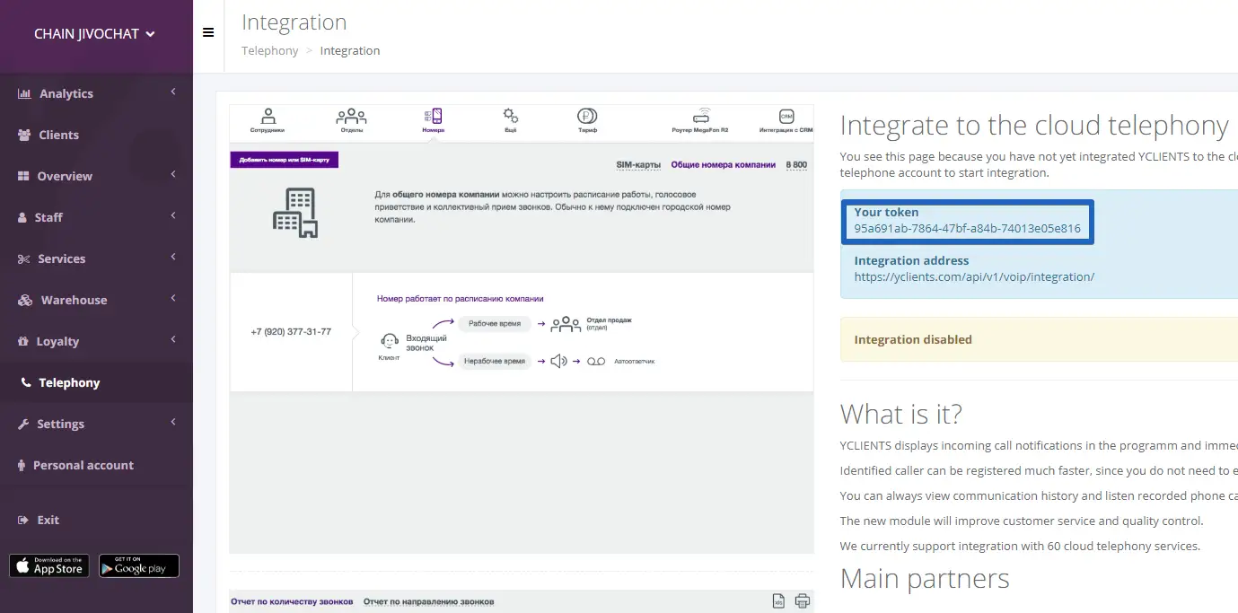 3.Llave del Teléfono: En el panel de Y-Clients, seleccione la opción "Chains" en la esquina superior izquierda. Luego seleccione la opción de teléfono en el menu del lado izquierdo. Copie el Token para pegarlo en el campo requerido en nuesta aplicación de Jivochat.