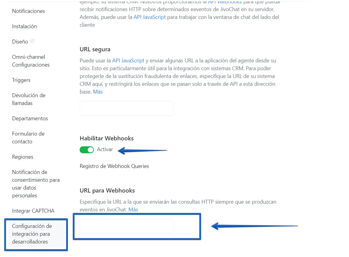 - En este menú debe localizar las configuraciones para desarrollador. Asegúrese de habilitar los Webhooks cómo en la imagen y pegue su API de DataCRM en el espacio en blanco: