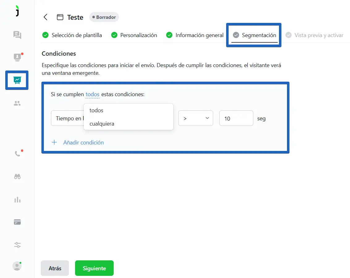 - Todas las condiciones: La campaña se activa solo si se cumplen todas las condiciones.