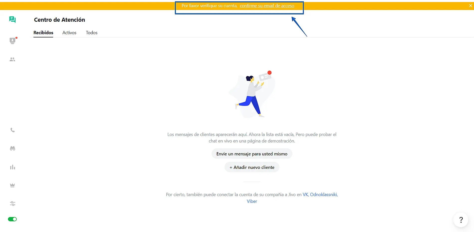 Verá la siguiente notificación en JivoChat hasta que el correo no haya sido verificado:
