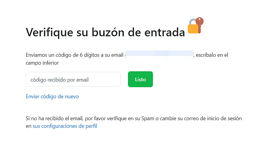 Haga clic en verificar su email para que se le envíe un código corto a su correo el cuál deberá pegar en la siguiente pantalla